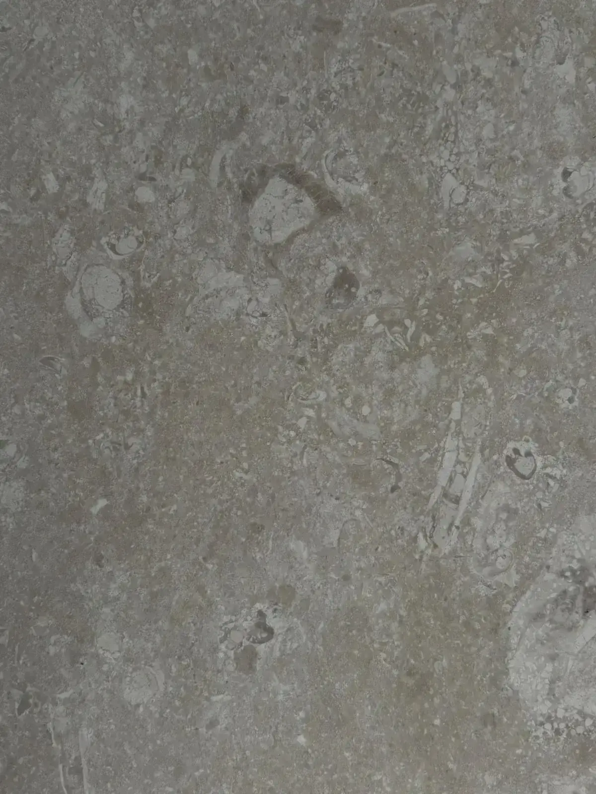 Naturmarmor in grau-beiger Farbgebung mit hellen fossilen Einschlüssen und lebendiger Oberfläche. Geeignet für stilvolle Innenflächen mit natürlicher Wirkung.