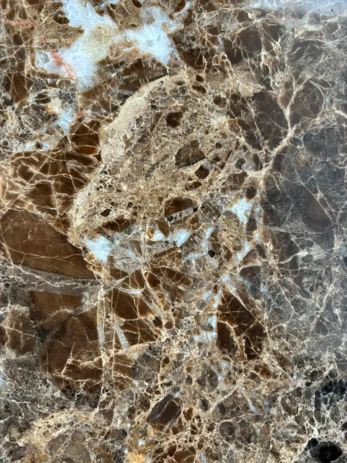 Dekorativer Naturmarmor in dunkelbrauner Farbgebung mit hellen Kontrasten und lebendiger Struktur. Geeignet für hochwertige Innenflächen mit eleganter Wirkung.