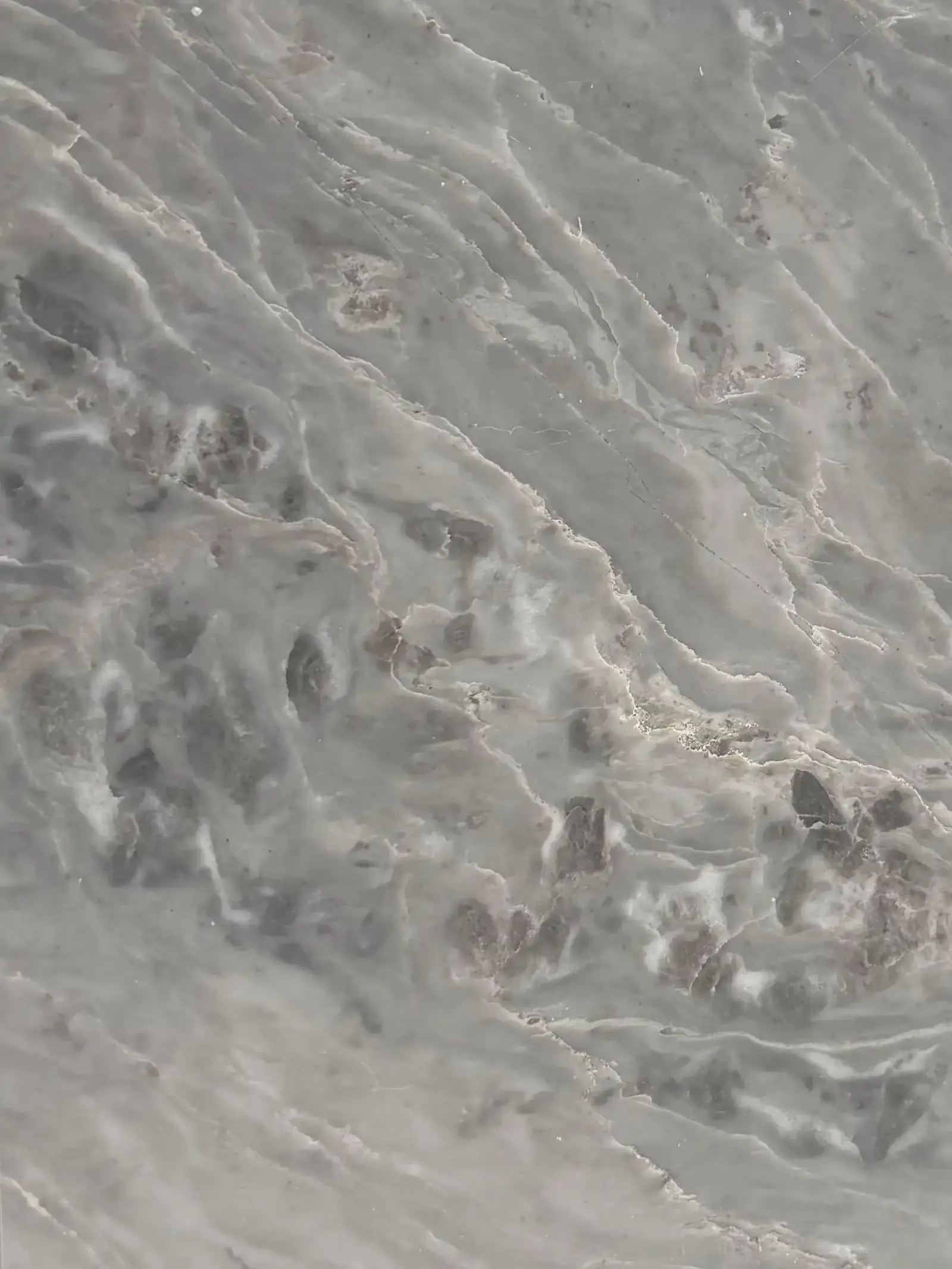 Grauer Marmor mit lebendiger, wolkiger Struktur.