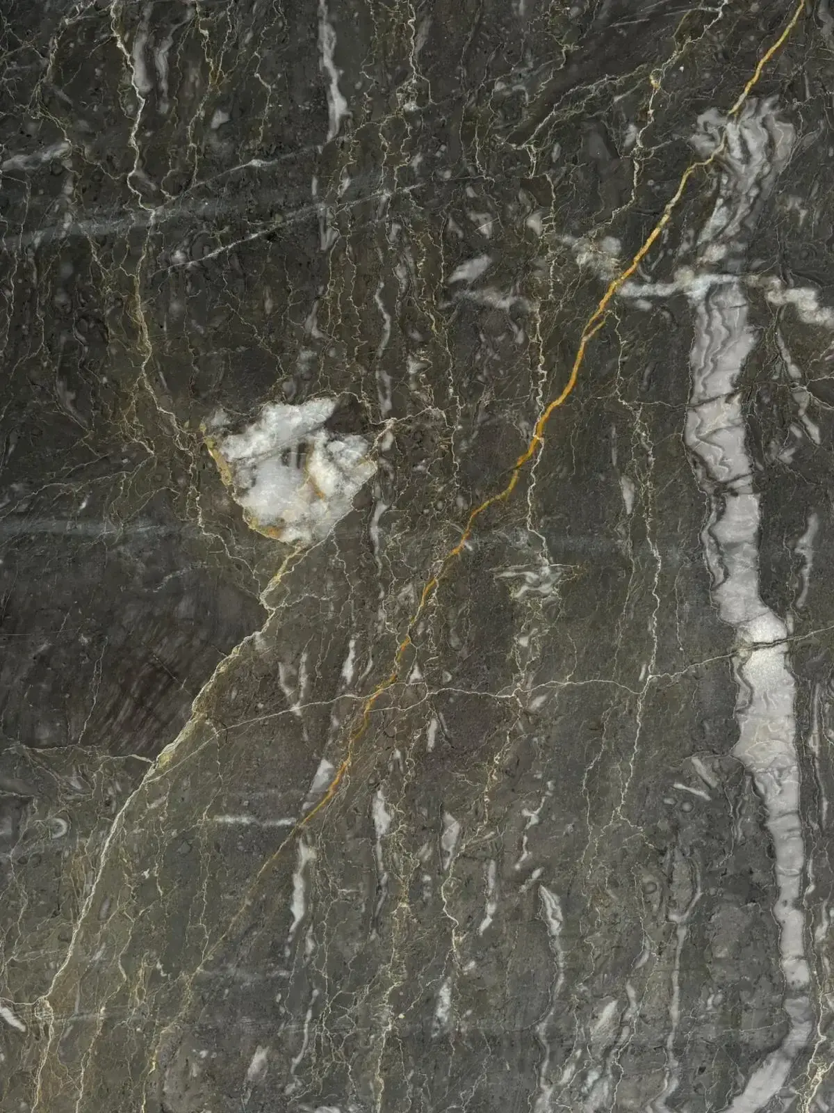 Dekorativer Naturmarmor in dunkelgrauer bis grüngrauer Farbgebung mit weißen Kontrasten und goldfarbenen Adern. Geeignet für hochwertige Innenflächen mit eleganter Wirkung.