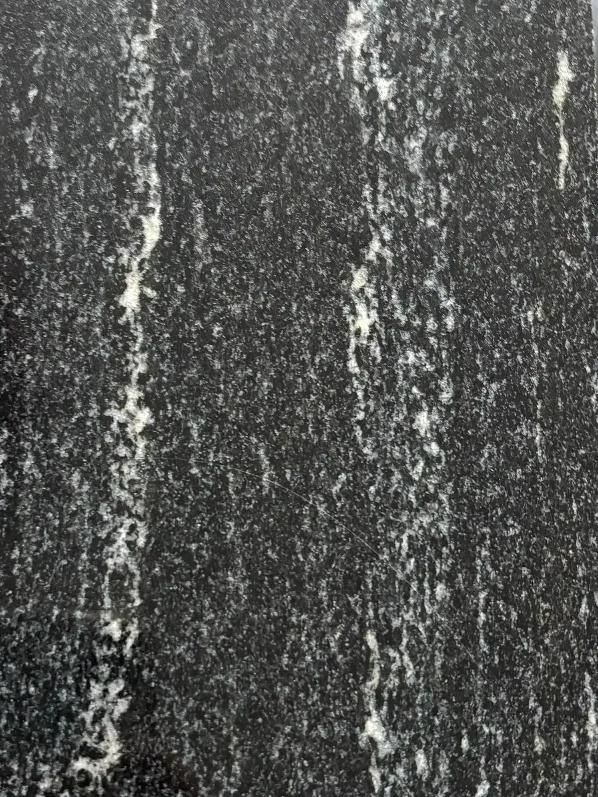Naturstein mit dunkelgrauer bis schwarzer Grundfarbe und auffälligen weißen, länglich verlaufenden Adern. Die kontrastreiche Struktur verleiht dem Material eine elegante und hochwertige Ausstrahlung.